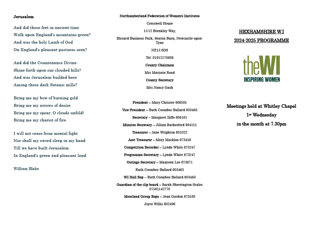 Grace Hadow, one of the founders of the Women’s Institute and a Suffragist, had the idea of transferring Jerusalem from the Suffrage movement to the W.I. So from 1924 the Women’s Institute and Jerusalem were linked. The W.I. also inherited the same colours from the women’s suffrage movement – green, white and violet.